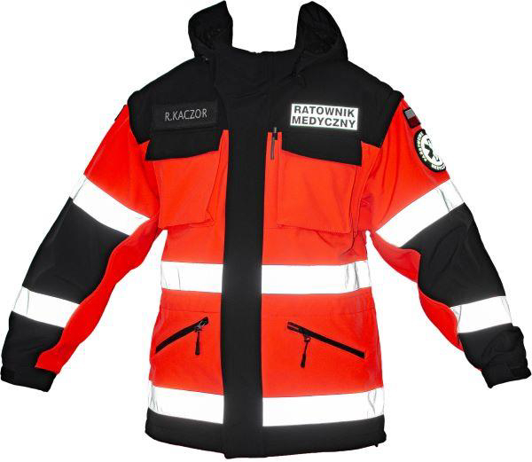 Wykonana zgodnie z Rozporządzeniem Ministra Zdrowia z dnia 3 stycznia 2023 r. w sprawie oznaczenia systemu Państwowe Ratownictwo medyczne oraz wymagań w zakresie umundurowania członków zespołów ratownictwa medycznego, wykonana z wysokiej jakości THERMO SHELL – SERIA 10000 H2O – 8000 g/m2/24h : lewa strona- 100% poliester, membrana 100% poliuretan; prawa strona – 96% poliester, 4% spandex, gr. 310 g/m2 , wstawki z czarnego THERMO SHELL w miejscach najbardziej narażonych na zabrudzenia i przetarcia.